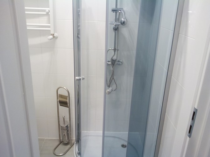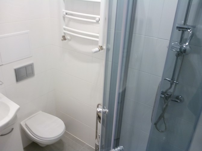 Łazienka: szafki na kosmetyki, kabina prysznicowa, WC, umywalka, lustro.