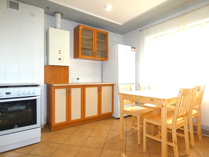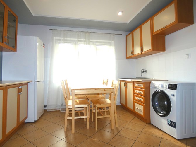 Kuchnia: szafki wiszące i stojące, lodówka, kuchenka gazowa z piekarnikiem elektrycznym, zlewozmywak, stół z krzesłami, pralka.