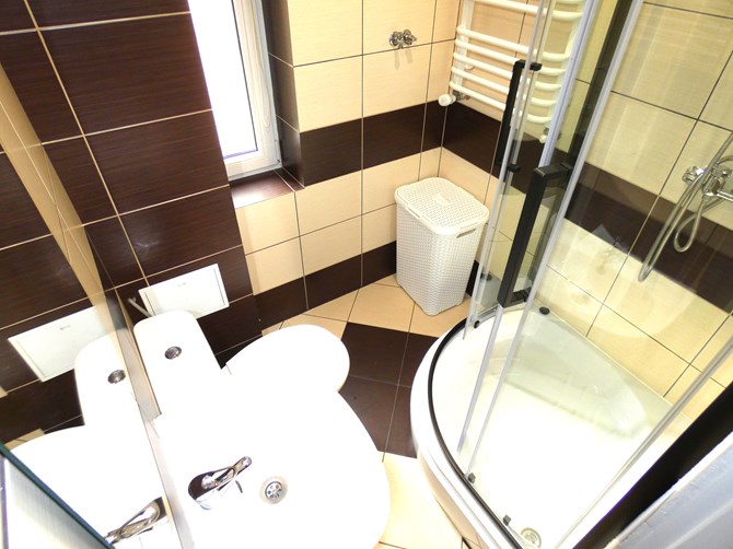 Łazienka (razem z WC): kabina prysznicowa, umywalka, lustro.