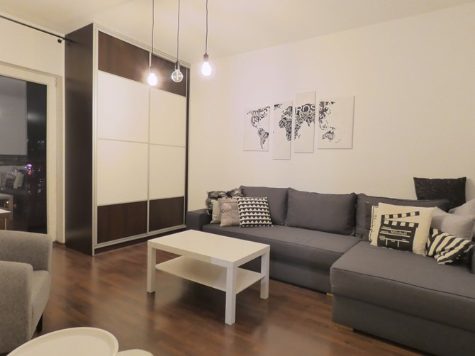 Pokój 1: rozkładana kanapa narożna, stolik kawowy, szafa, komoda, wyjście na balkon (deska do prasowania, suszarka na ubranie, mała drabinka.