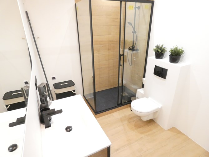 Łazienka: prysznic, umywalka, lustro, toaleta.