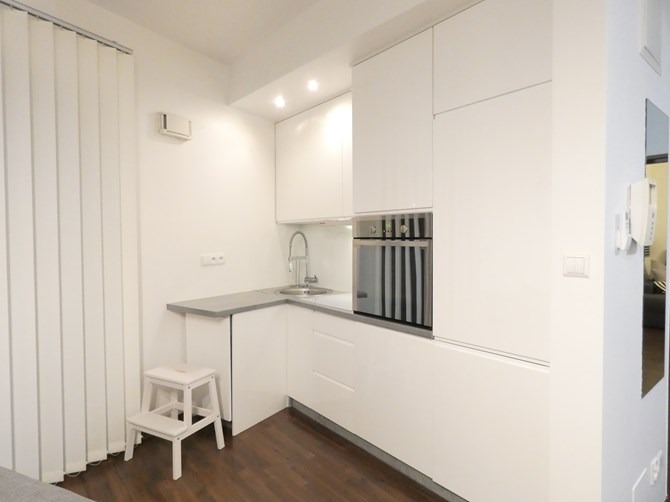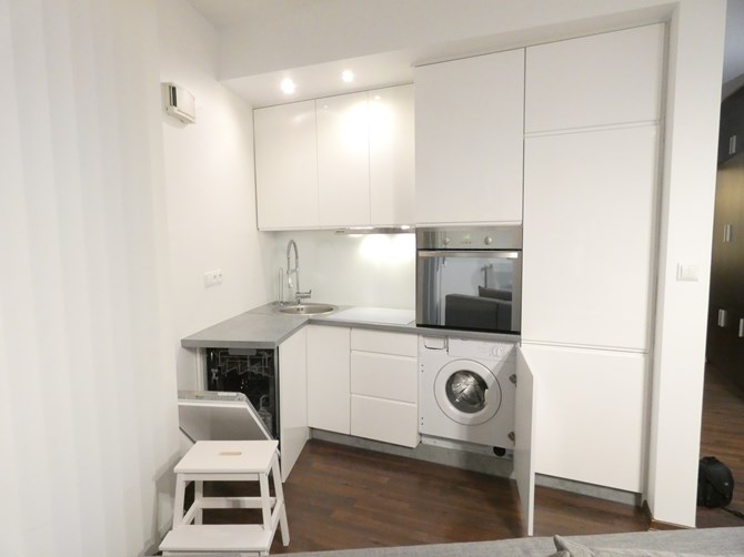 Aneks kuchenny: piekarnik, płyta indukcyjna 4 polowa, lodówka, zamrażarka, zmywarka, zlew, szafki stojące i wiszące, okap, palka.
