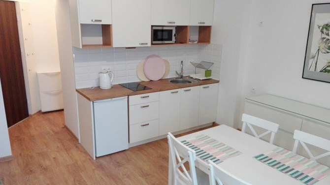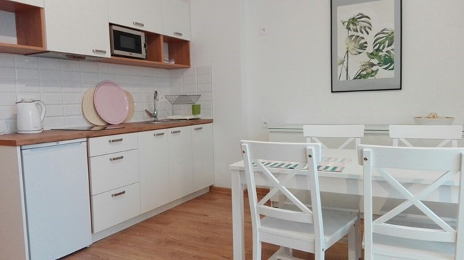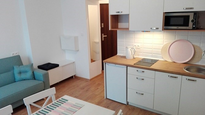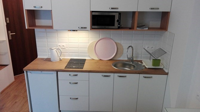 Aneks kuchenny: zlewozmywak, mikrofala, czajnik, płyta grzewcza, okap, szafki.