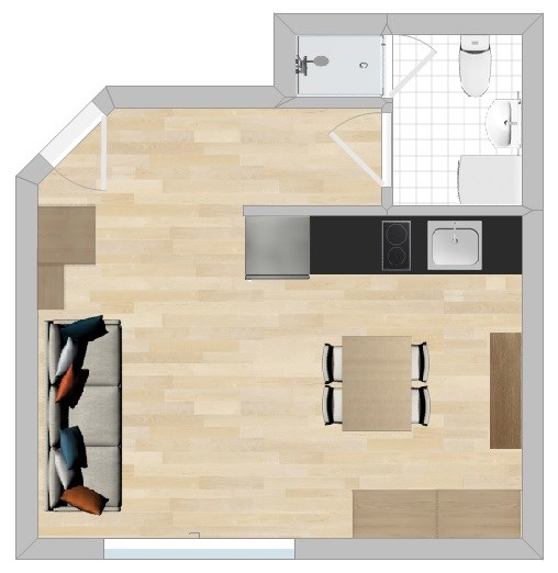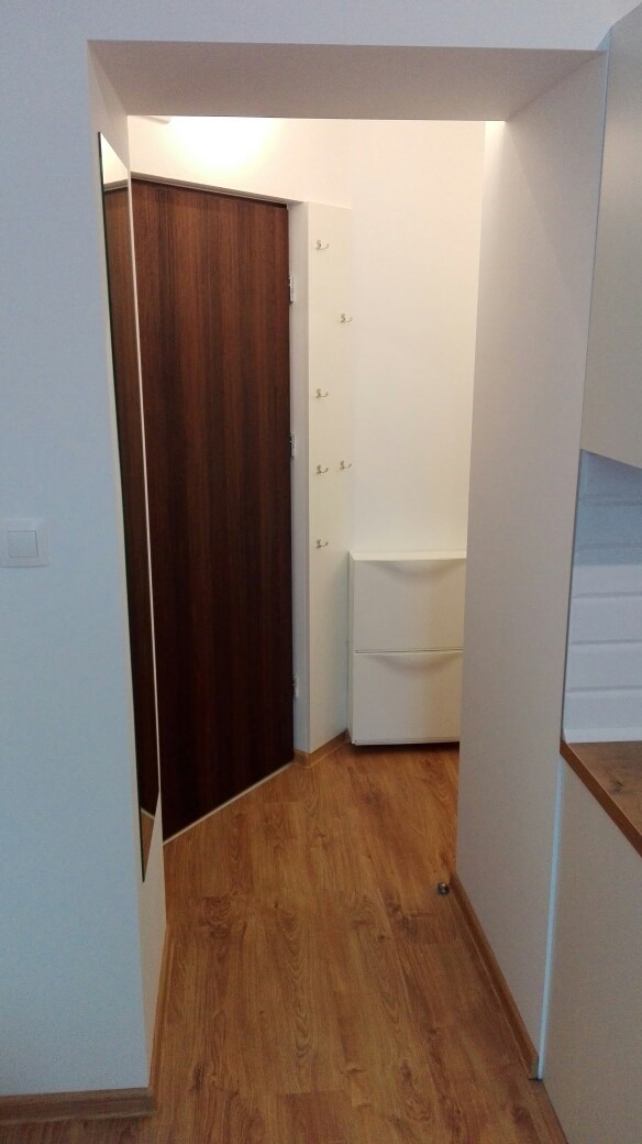 Lokal składa się z przedpokoju, z którego prowadzi wejście do nowoczesnej łazienki oraz dużego, widnego pokoju z aneksem kuchennym.
