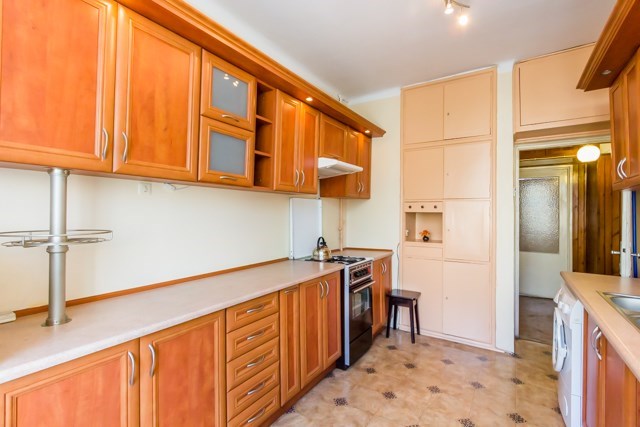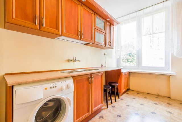 Kuchnia: szafki stojące i wiszące, kuchenka elektryczna z piekarnikiem, dwie lodówki (w tym jedna nowa), pralka.