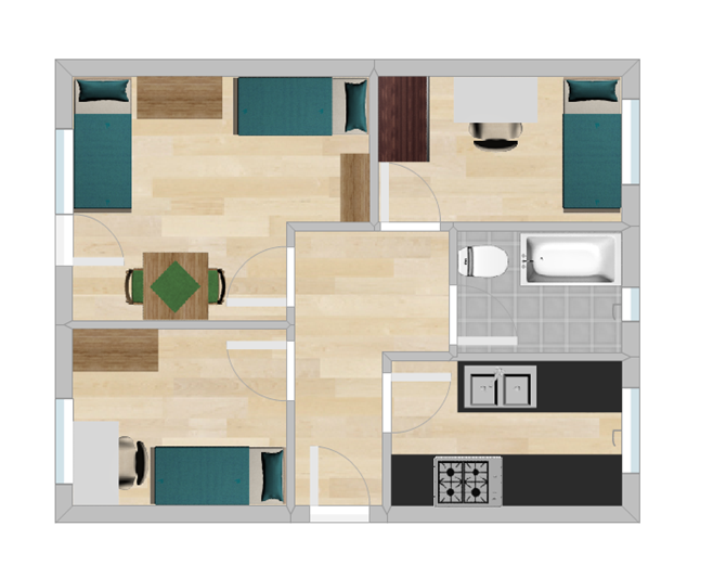 Pokój: dwa jednoosobowe łóżka, dwa biurka, krzesło, szafa w zabudowie.