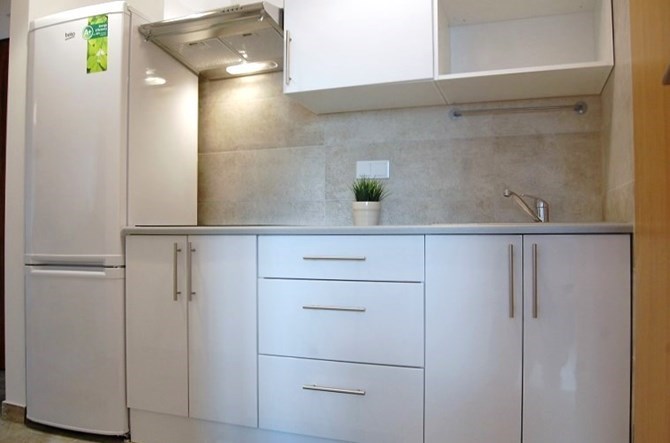 Aneks kuchenny: meble kuchenne, duża lodówko-zamrażarka, płyta ceramiczna 4-palnikowa, kuchenka mikrofalowa.