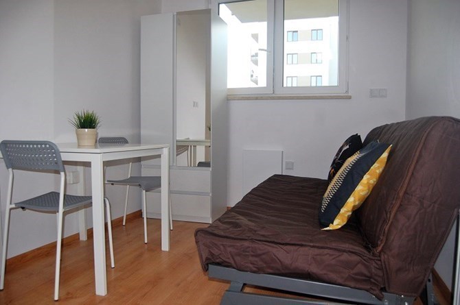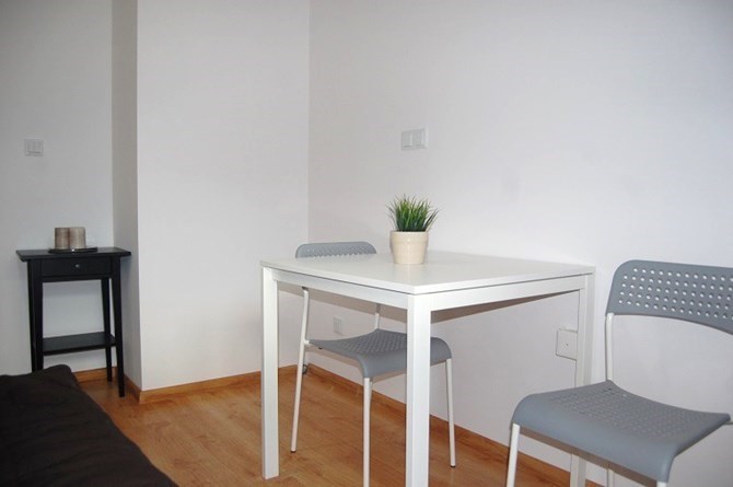 Pokój: rozkładana kanapa, stół + 2 krzesła, duża szafa, mała lampka.