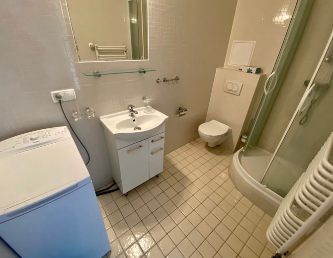 Łazienka razem z WC: lustro z półką, kabina prysznicowa, pralka