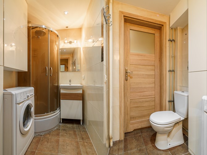 Łazienka: pralka, kabina prysznicowa, WC, umywalka, lustro.