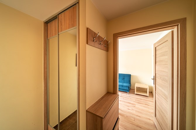 Przedpokój: szafa, szafka na obuwie, wieszak.