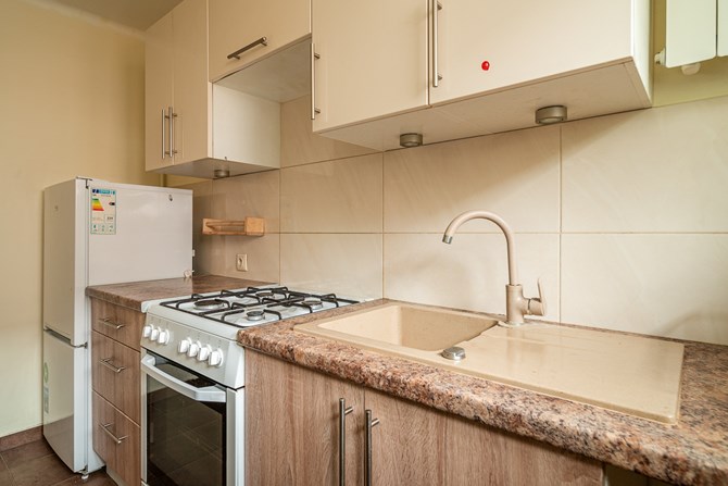 Kuchnia: szafki, stolik i krzesła, lodówka, kuchenka gazowa z piekarnikiem.