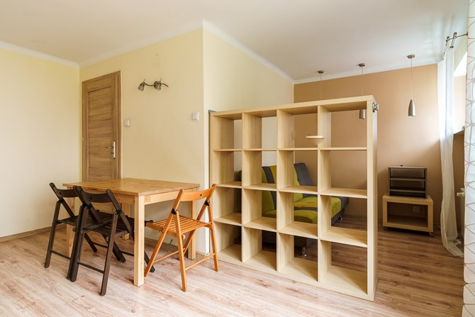 Jasne i ustawne mieszkanie z wydzieloną strefą sypialnianą.