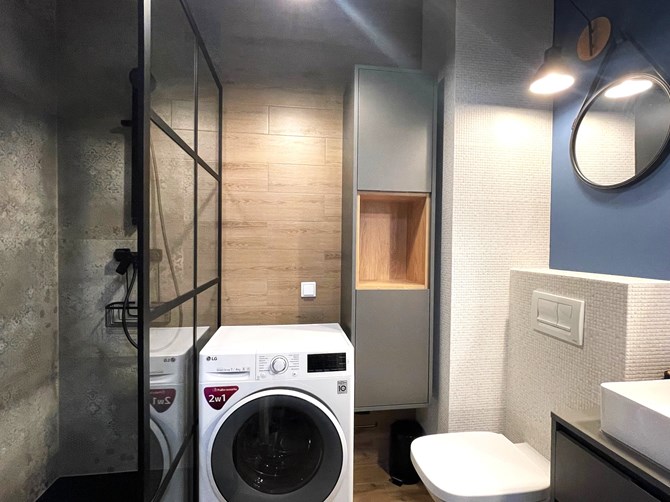 Łazienka z WC: kabina prysznicowa, umywalka, pralka, szafki, WC.