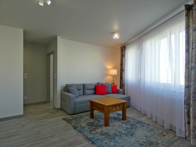 Salon z balkonem: narożnik rozkładany, stolik, szafka RTV.