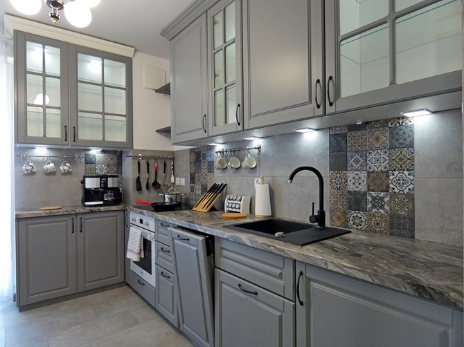 Kuchnia: szafki wiszące, stojące, zlew, zmywarka, płyta indukcyjna, piekarnik, ekspres, lodówko-zamrażarka, stół z krzesłami.