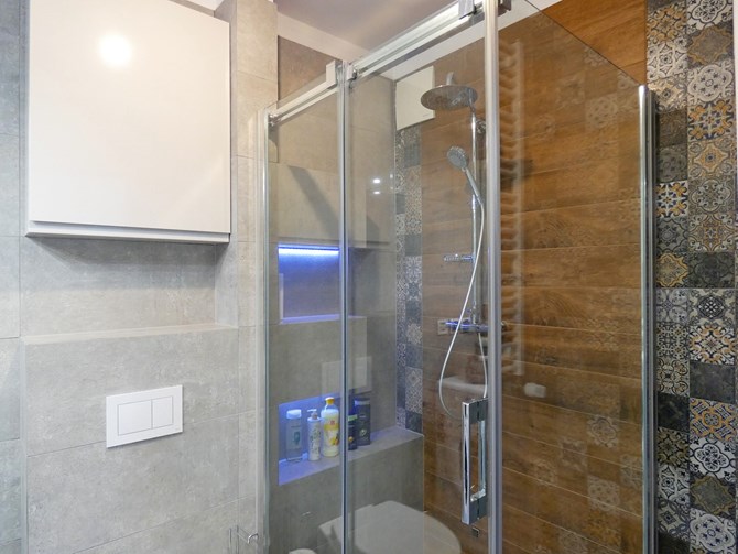 Łazienka: kabina prysznicowa, umywalka, pralka, WC, szafki.