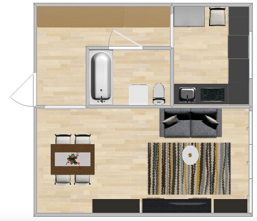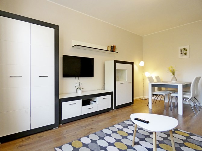 Pokój: TV, dekoder + ruter, kanapa rozkładana, stół + 4 krzesła, szafka RTV, regał, szafa, stolik kawowy, lampa.