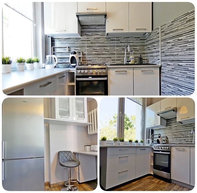 Kuchnia: lodówko-zamrażarka, okap, 4-palnikowa płyta gazowa, piekarnik, toster, ekspres Dolce Gusto, zlewozmywak, czajnik elektryczny.