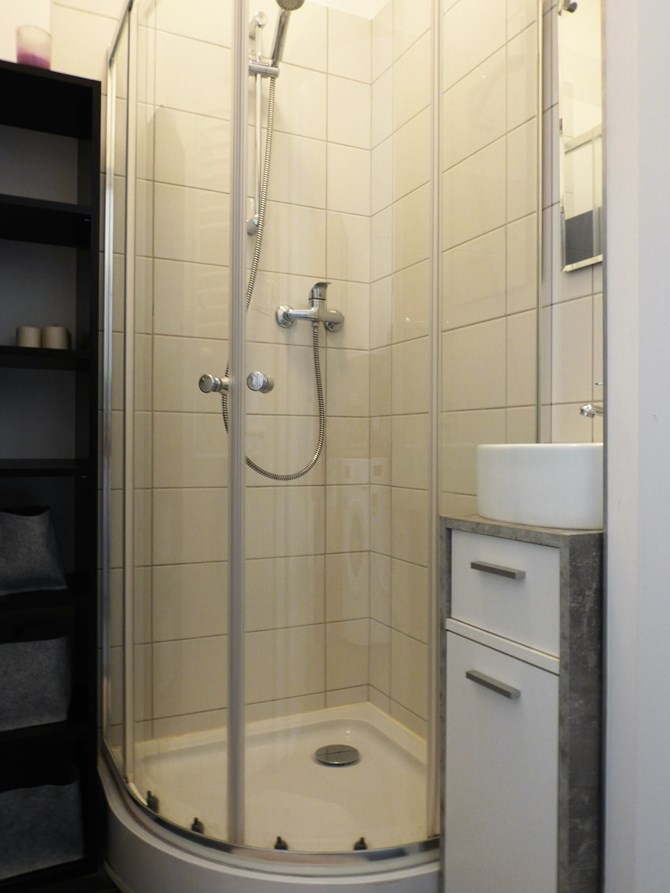 Łazienka połączona z WC: kabina prysznicowa, szafka, umywalka, lustro.