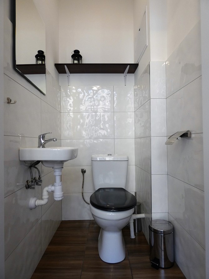 W kamienicy znajduje się wspólna kuchnia oraz łazienki dostępne dla mieszkańców.