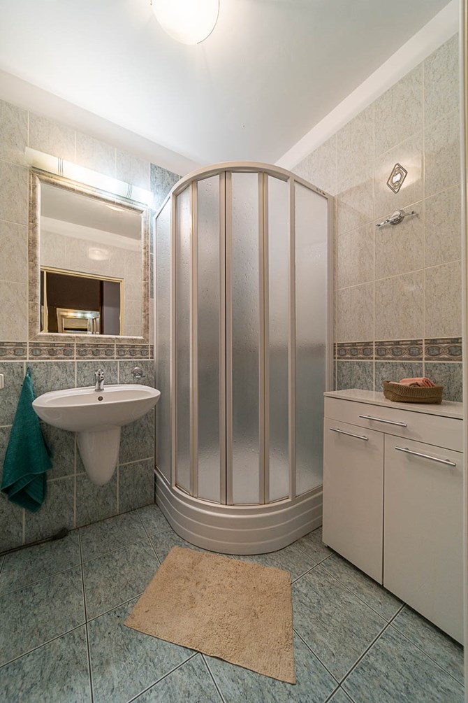 Łazienka: prysznic, pralka, umywalka z szafką, szafka stojąca.