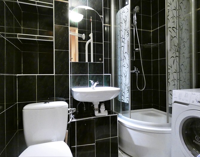 Łazienka: kabina prysznicowa, umywalka, lustro, pralka, WC.