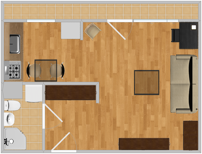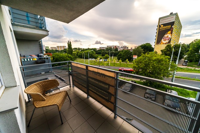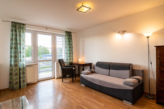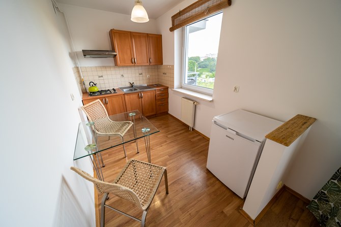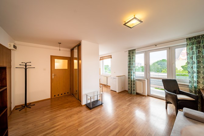 Składa się przestronnego, bardzo jasnego, dużego pokoju, oddzielnego aneksu kuchennego z mini jadalnią, łazienki z WC, przedpokoju oraz dużego balkonu.