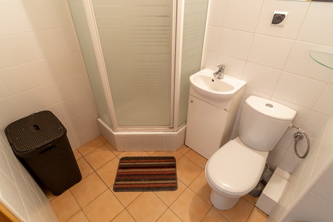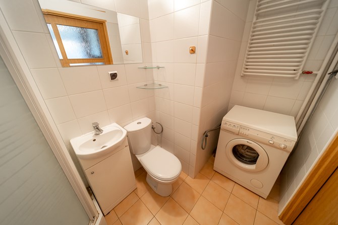 Łazienka: kabina prysznicowa, umywalka, pralka oraz WC.