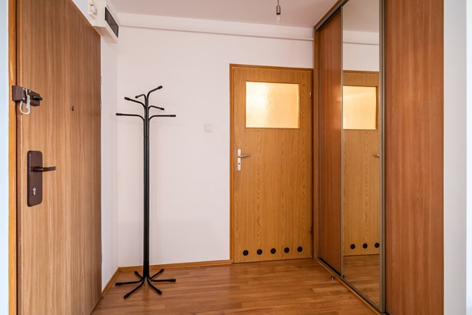 Przedpokój: szafa z przesuwanymi drzwiami, wieszak na ubrania.