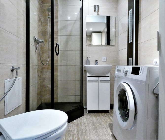 Łazienka (razem z WC): lustro, umywalka, szafki, kabina prysznicowa, pralka.