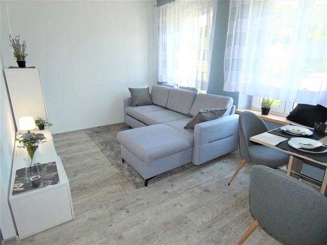 Składa się z salonu, aneksu kuchennego i sypialnianego oraz łazienki z WC.