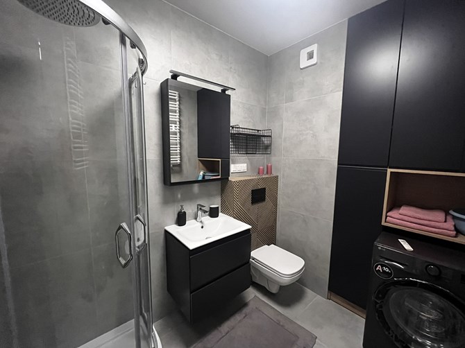 Łazienka: kabina prysznicowa, szafki, pralka, umywalka, lustro.