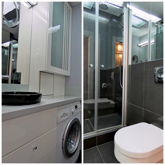 Kuchnia: lodówko-zamrażarka, okap, 4-palnikowa płyta indukcyjna, zmywarka, piekarnik z funkcją mikrofali, zlew.