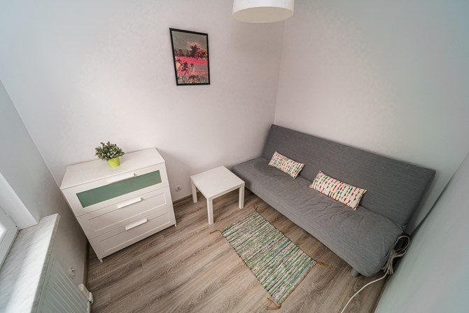 Pokój: rozkładana kanapa, stolik i komoda.