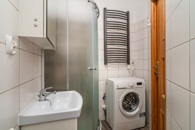 Łazienka: kabina prysznicowa, umywalka, pralka oraz WC.
