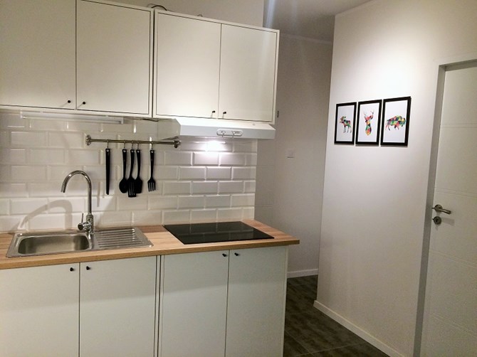 Kuchnia wyposażona w dużą lodówką, płytę grzewczą oraz przybory kuchenne