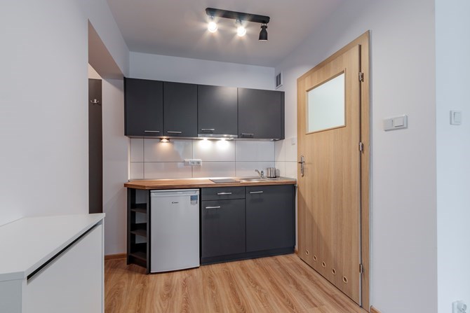 Aneks kuchenny: szafki wiszące i stojące, lodówka, dwupalnikowa płyta elektryczna, zlewozmywak, okap.
