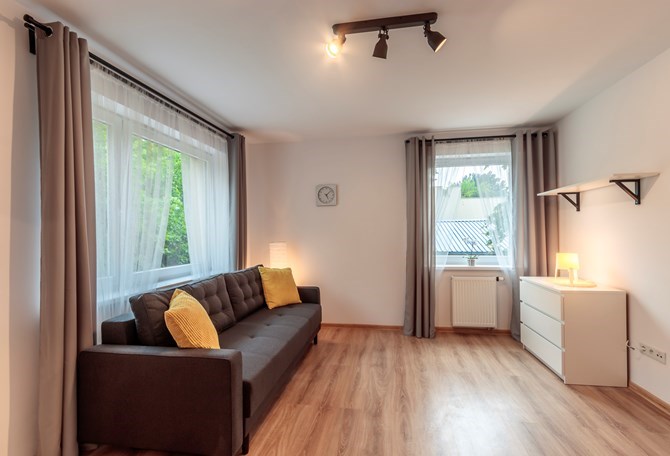 Pokój: rozkładana dwuosobowa sofa, stół z dwoma krzesłami, pojemna szafa, komoda, półka.
