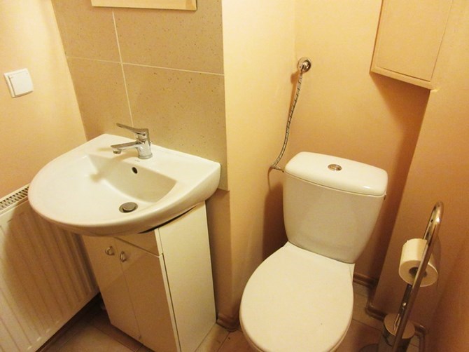Łazienka: kabina prysznicowa, umywalka, pralka oraz WC.
