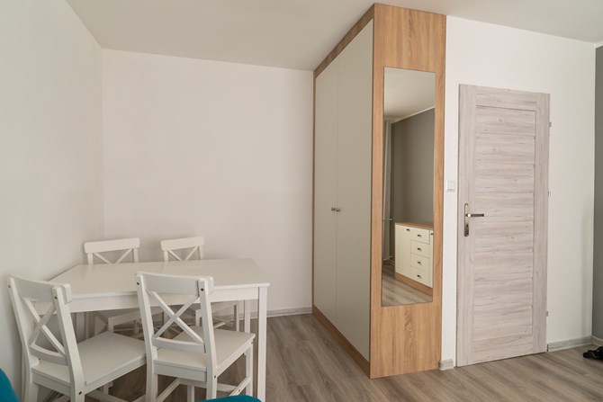 Pokój: kanapa (rozkładana), stół + 4 krzesła, ława, komoda, duża szafa dwudrzwiowa.