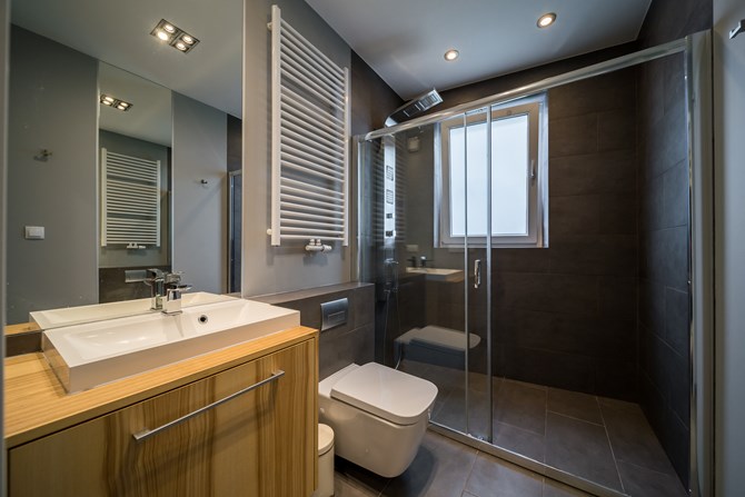 Łazienka: umywalka z szafką, WC, prysznic z wieloma dyszami.