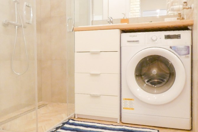 Łazienka: kabina prysznicowa, toaleta, umywalka, pralka.
