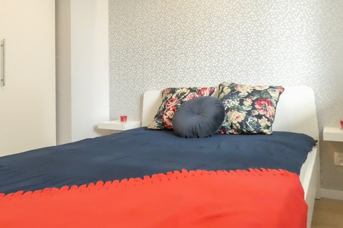 Sypialnia: podwójne łóżko, półki przy łóżku, szafa na ubrania.
