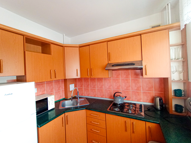 Kuchnia z kącikiem jadalnianym: lodówka, mikrofalówka, kuchenka gazowa.
