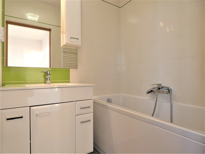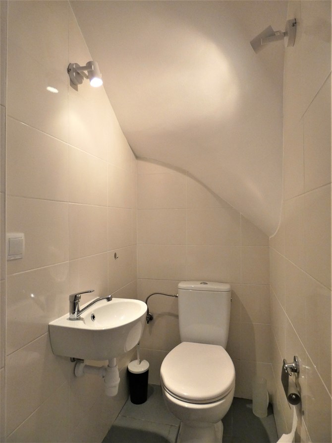 Łazienka (piętro): wanna, WC, szafki, umywalka, pralka.