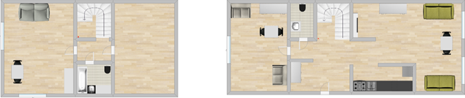 Pokój 2: 2 rozkładane kanapy, stół z krzesłami, szafa, szafka RTV.