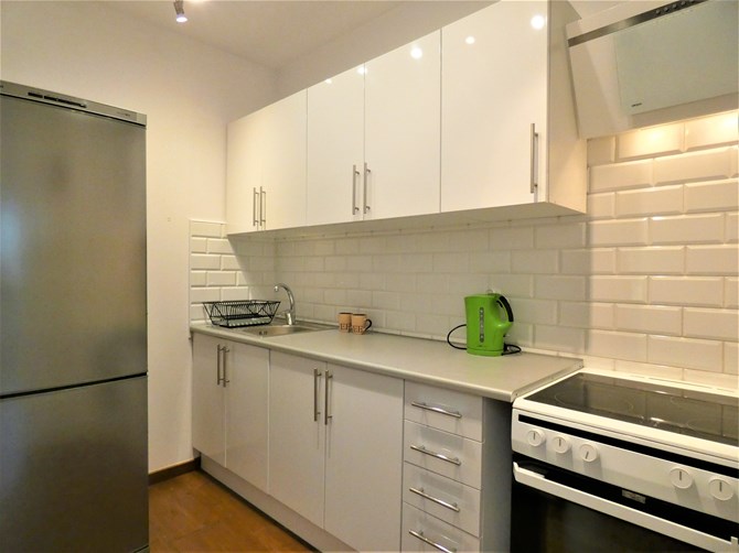 Kuchnia: szafki wiszące i stojące, lodówko-zamrażarka, kuchenka z piekarnikiem, zlew, okap, czajnik.