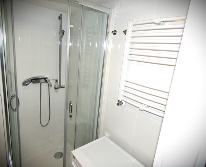 Aneks kuchenny: szafki wiszące i stojące, lodówka, piekarnik elektryczny, płyta indukcyjna (2 pola), okap, pralka.