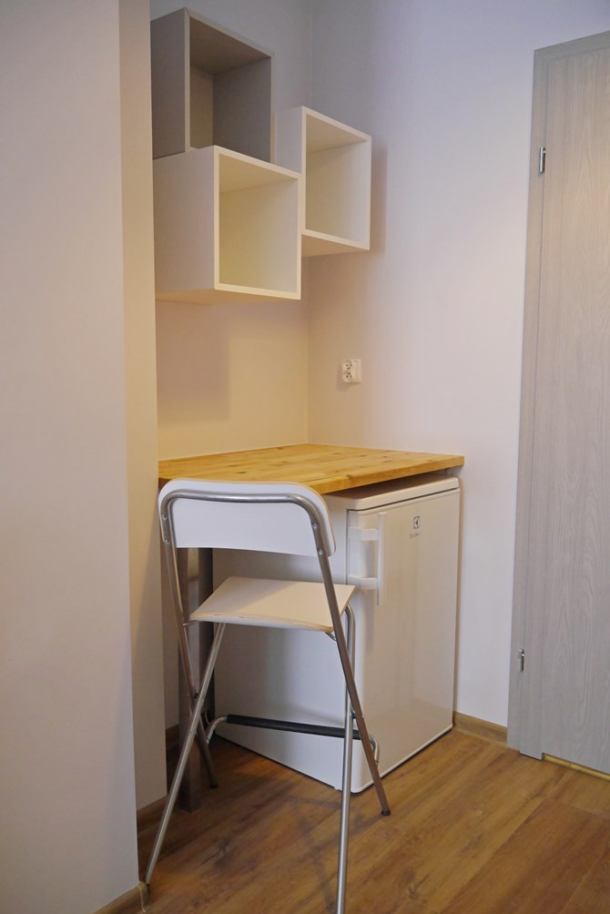 Aneks kuchenny: szafki, składane krzesło, zlewozmywak, lodówka oraz elektryczna płyta dwustanowiskowa.